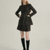 Design: Square neckline with lace trim, button pockets, faux flap pockets at front, hidden zipper at back, non-stretch tweed